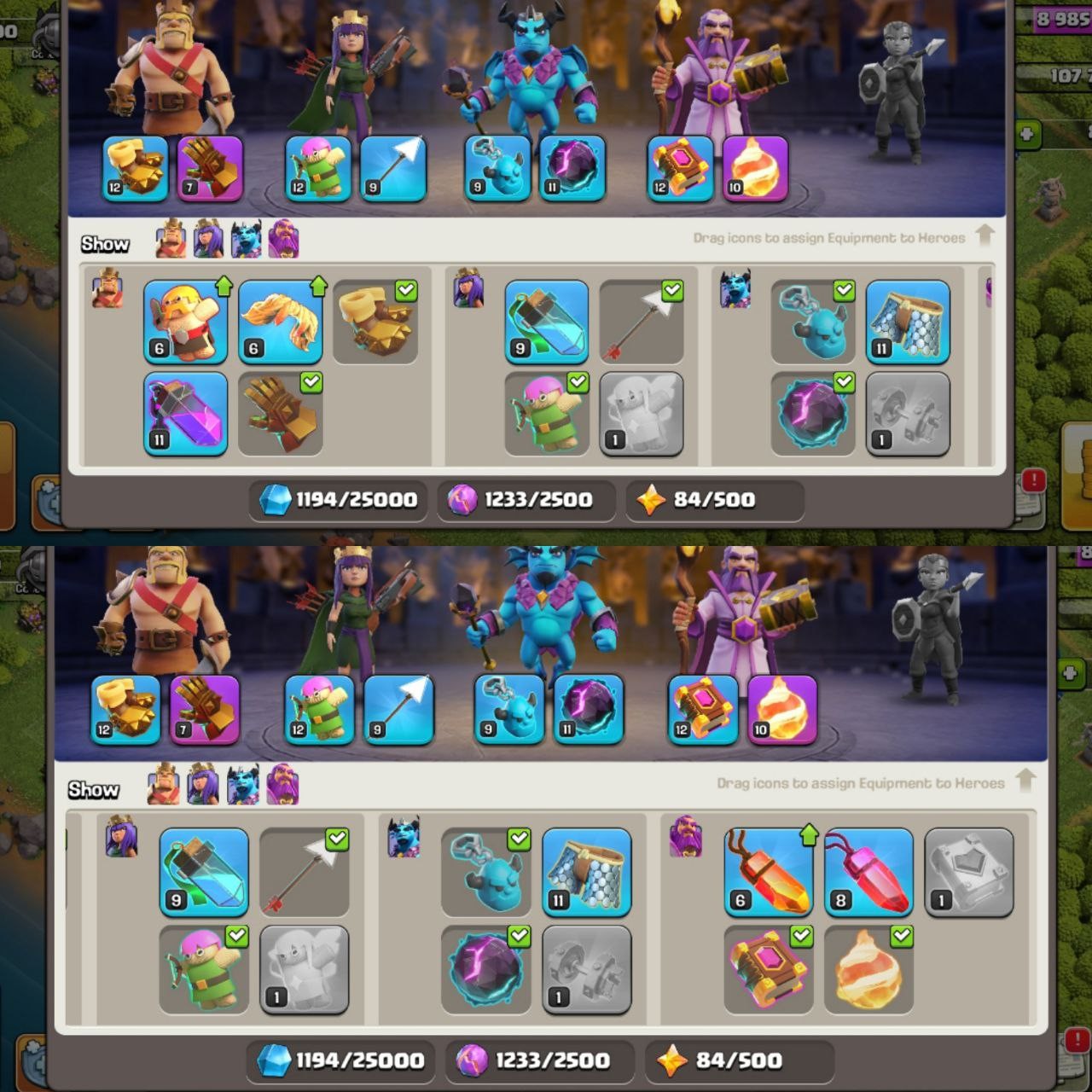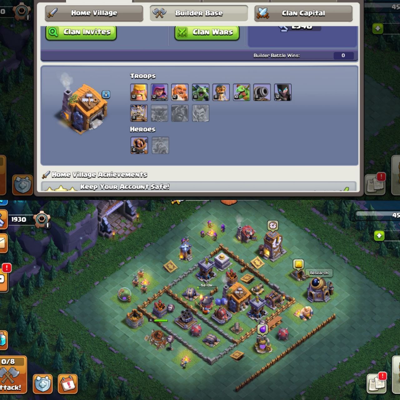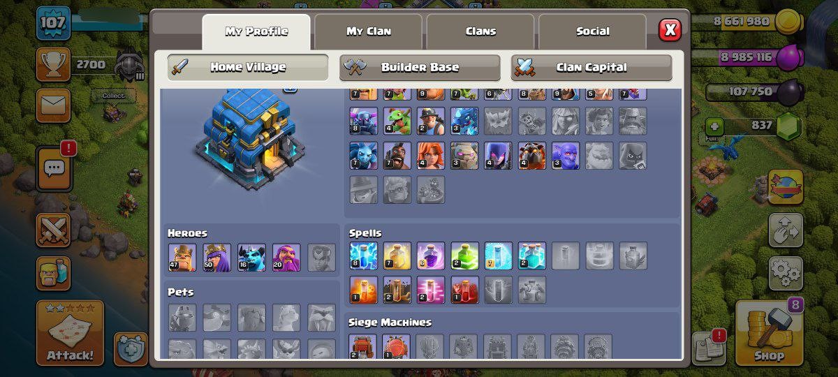 ⚔️ Account Details......................................................Town Hall Level :12Barbarian King Level :47Archer Queen Level :50Minion prince: 16Grand Warden:20Battle Machine Level :6Gems: 837 gemsChange name:500 GEMs